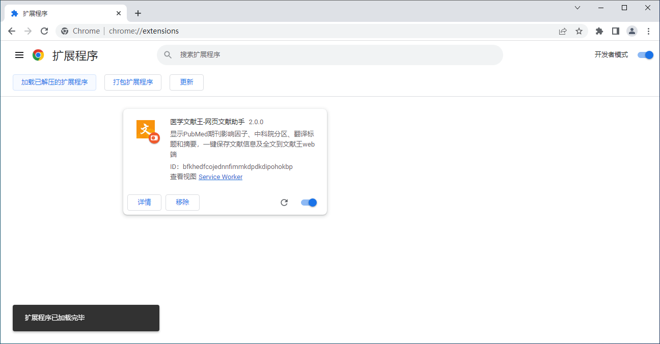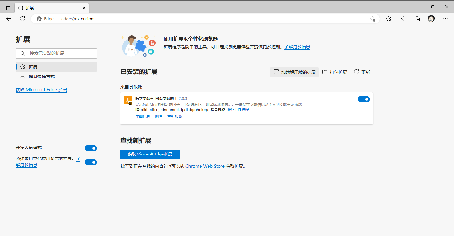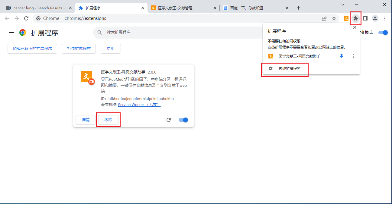 答:打开Chrome浏览器或Edge浏览器的【管理拓展程序】找到医学文献王-网页文献助手,点击【移除】,此时会自动打开插件使用说明页,点击顶部的【下载插件】,按照插件安装步骤重新安装即可。