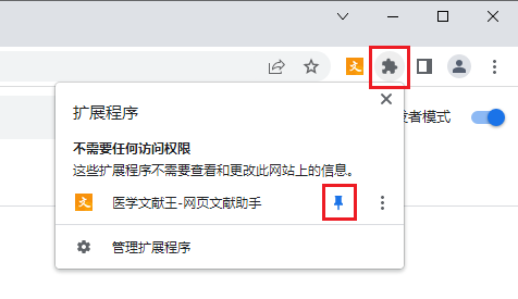 5)固定拓展程序,点击右上角扩展程序按钮,点击图钉,固定