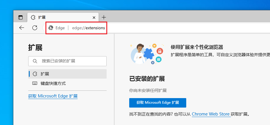 2)打开Edge浏览器(需最新版浏览器),粘贴链接到地址栏,按回车键进入Edge“ 扩展” 页面